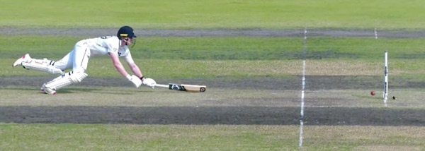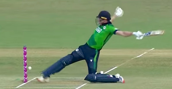 Harry Tector cannot prevent his defensive shot removing the bails (T-Sports)