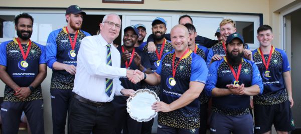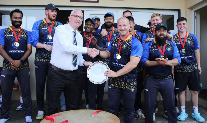 NW Chairman Brian Dougherty presents trophy to Woodvale (CricketEurope)
