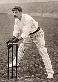 At 9 we have our wicket keeper JAMES KELLY who was born on 10 May 1867 of Irish descent. A limited but courageous right hand bat, he was probably second only to the great Jack Blackham among Australia's pre First World War glovemen. Having moved to NSW as Blackham kept for Victoria, James succeeded him in the Test side on the English tour of 1896, keeping in 36 successive Tests until the end of the 1905 tour including the nerve-wracking Manchester and Oval Tests of 1902. A tall man with a prominent walrus mustache, he became the first keeper to allow no byes in an innings of over 500, when England posted 551 at Sydney in 1897/98 while, also at the SCG, three years later, he held 8 catches in a Test. An old-fashioned wicket keeper, he stood, legs wide apart, right up to the stumps except to Tibby Cotter and a few other bowlers of genuine pace. He was eventually forced to retire on medical advice after the 1905 tour of England, having been hit over the heart while batting at Old Trafford. Married to the sister of Victor Trumper's sister in law, he was born 2 days before his close friend, thr great medium pacer Hughie Trumble and died on the same day 14 August 1938. In all first class matches he made 4018 runs at 19.94 with 3 hundreds and a highest score of 108, besides holding 243 catches and making 112 stumpings. In Tests he made 664 runs at 17.02. Highest score 46*, held 43 catches and made 20 stumpings.