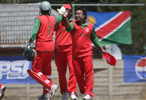 Namibia v Oman: Oman players celebrate after running out Namibian captain Bjorn Kotze