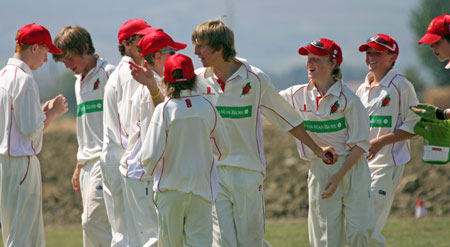 Adam McAuley congratulated after taking two wickets in an over to finish the game.
