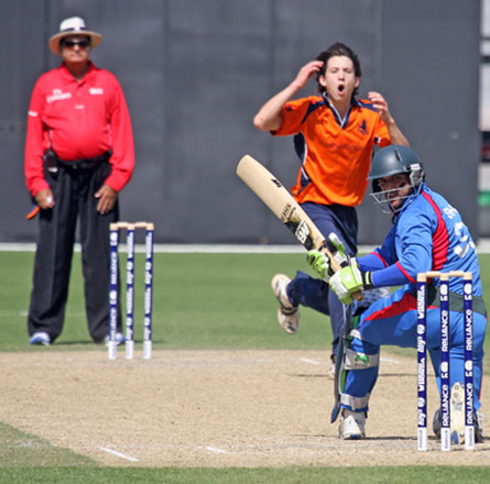 The Netherland's Bas Zuiderent is out to Afghanistan's Shenwari for a disappointing 2 runs.