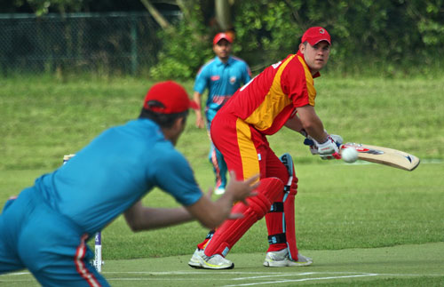 Qamar Abbas hits the stumps to get the run out