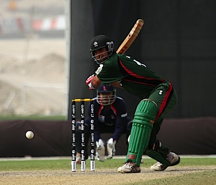 Driven through the covers off the back foot by Paras Khadka