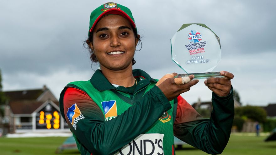 Nigar Sultana accepts her Player of the Match award from CS President Willie Donald