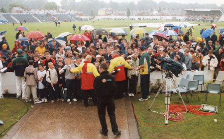 Australia played the same eleven in the first three winning Tests. Of that eleven seven played in this match. They were Hayden, Mark Waugh, Ponting, Martyn, Warne, Lee and McGrath. The Captain, Steve Waugh was injured and did not come to Ireland nor did he play in the fourth Test. His Vice Captain Gilchrist was also not in Ireland so Ponting captained the team probably because he had two great aunts in Belfast. Hayden and Mark Waugh played in the 1993 match in Dublin while Mark Waugh Langer, Ponting and McGrath played at Eglinton in 1997. Ireland had no survivor from 1993 but three played in the 1997 match, McCallan, who made 64*, Heasley and Andy Patterson.