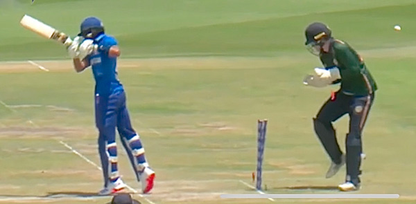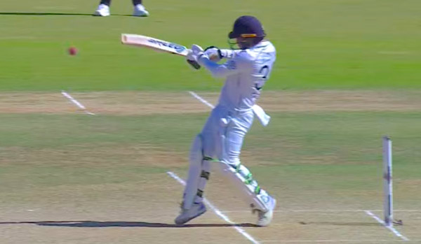 Harry Tector cannot prevent his defensive shot removing the bails (T-Sports)