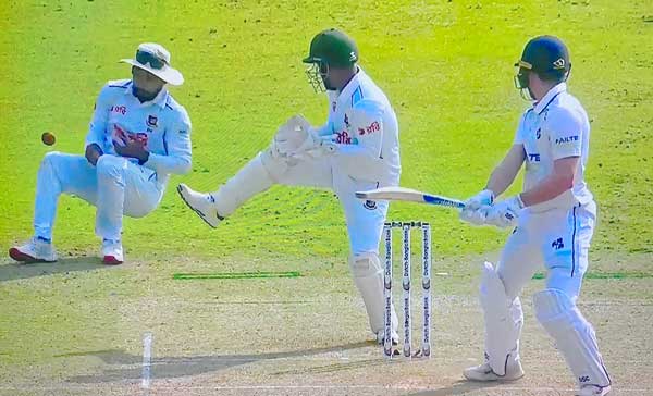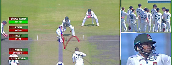 A brief bright spell from Ireland who took the wickets of Islam and Shanto inside the opening five overs but otherwise for them it has been a day like the others before it. Islam played back and was trapped lbw by one that kept low, while one from Jordan Neill took-off, skipper Shanto fending it off lobbing gently to Balbirnie in the gully. Signs of what Ireland must contend with later. The lead at Lunch was 491, so what are we waiting for, 500+ or Haque's century? The lead passes 500, but no century for Haque who drives Hoey to Campher at shortish extra cover, and the hosts decide they have enough. Ireland's target 509! Balbirnie gone, lbw on the back foot to left-arm spinner Taijul Islam and Stirling follows bat/pad to short leg. Some turning, some sliding on, some climbing, some keeping low, batting a lottery. Fifty partnership between Tector and Carmichael but broken by Murad's first delivery - clipping leg stump and umpire's call. A battling fifty by Harry Tector held up the hosts but coming down the pitch to Murad he fails to clear deepish mid-off. Tucker survives an edge that is taken on the bounce by keeper Das but falls next over in similar fashion. Doheny lbw, a third wicket for Islam. Ireland ensure the game goes to the final day but it will just be a question of how long they can delay the inevitable.