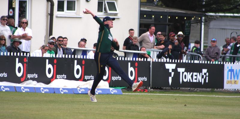 A bat/pad catch from Paul Stirling to short leg (T-Sports)