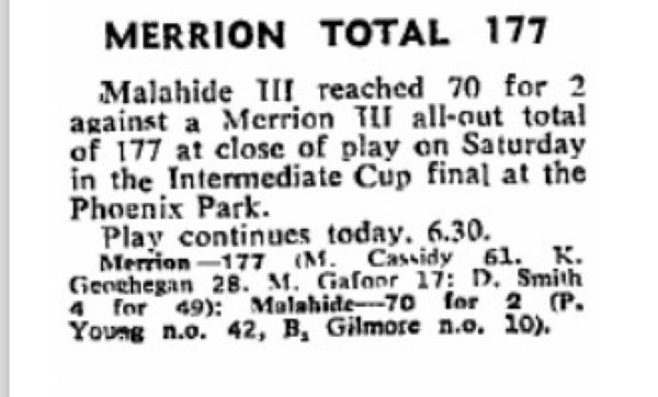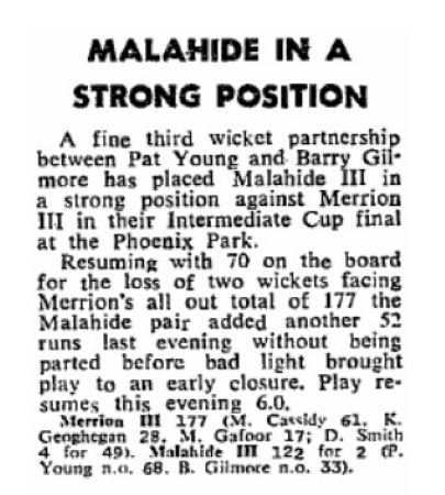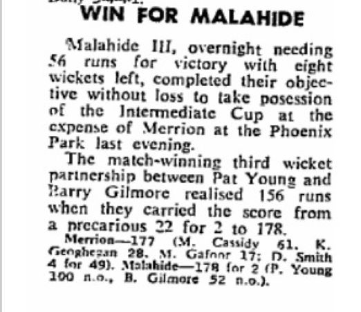Cassidy survived an early life when 16 year old Barry Gilmore dropped him on the boundary in front of the pavilion. Some memories stick! Barry recalls “Cassidy pulled the ball low and hard about head height and dipping. I moved forward, just got my hands to it down by my bootlaces but the ball spilled out onto the turf.” Doc Smith was the outstanding Malahide bowler on the day with 4 for 49.