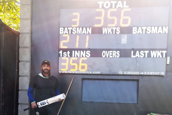Saif batted No.3 and came in with the score on 55 in the 12th over. He was there until the innings closed on 356-4, scoring 211 in 28 overs at the wicket. He hit 9 sixes and 28 fours and faced 92 balls.