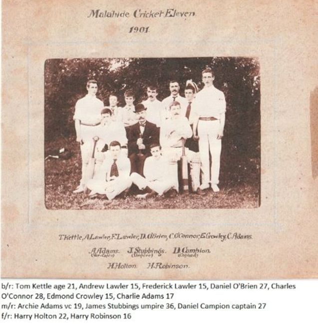 A feature of the photo are two tall young men standing like sentinels at either end of the back row. Tom Kettle (age 21) on the left and Charlie Adams (age 17) on the right. In what seems to be the custom at the time both Kettle and Adams are each holding a cricket ball indicating the pair as opening bowlers. And both are figures of note.