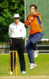 Dutch seamer Maurits Jonkman has been ruled out of the World Cricket League Division 1 tournament because of a persistent injury, and will be replaced in the squad for the remaining two matches by his 31-year-old, South African-born clubmate at HCC, Bernard Loots (pictured right, bowling in an A team fixture against France last month).