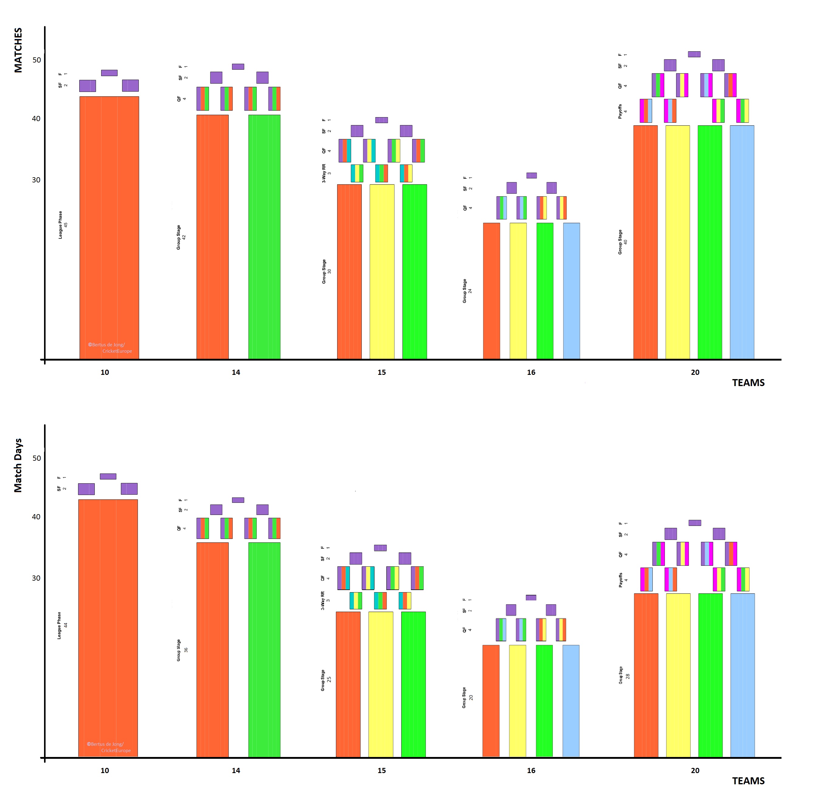 Back then to the other extreme, the ICC's currently-favoured 10-team format, which fares more-or-less as expected. The bloated league phase is resistant to compression, leaving the format right at the top of the interminability table. The lack of knock-out games could theoretically be fixed by introducing playoffs or quarters at the expense of ever greater incessance, but then 45 games seems like an inordinate length to go to just to eliminate Zimbabwe and, realistically, England.