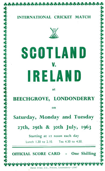 Another new venue was tried for this match, the Brigade CC ground at Beechgrove in Derry. A match had never been played at Derry, the nearest being against MCC at Strabane in 1934. The Beechgrove ground is small and pretty and there were two days of glorious sunshine for the match. A good crowd attended on the first day but there were few present to see Ireland win the match on the second day. Bad weather prevented some wicket preparation and on the second afternoon the wicket began to take turn and lift. Huey exploited it with a brilliant spell of bowling. Ireland had last beaten Scotland in 1957 and now the series was equal at 13 wins each. Scotland only had one newcomer to the Irish match - a batsman RG Hill.