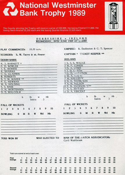 Ireland brought in Nulty (new cap), Halliday (for the unavailable McBrine), Jackson (who was captain) and Jeffrey (who last played in the 1987 Nat West match). As well as McBrine, Semple, Rutherford, McCrum dropped out. Derbyshire were at full strength. Barnett had been on the losing England side at Lords the previous day against Australia and Holding was the recently retired West Indies fast bowler.