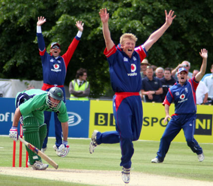 John Mooney came in and hit Bell for a six to long-on in the bowler's fifth and last over. His final figures were 2-39. Langford-Smith scored his 12 runs in 11 balls but was out to the last ball of Dalrymple's ninth and last over to give the off-spinner his only wicket. Langford-Smith went down the pitch, missed and was stumped, becoming Jones's third victim. 235-9-9. Paul Mooney joined his brother with four overs remaining. Both did well and the 10th wicket did not fall. The overs were bowled by Plunkett and Harmison and the brothers had a four each in a stand of 28 runs. John Mooney reached 30 from 26 balls with a six and a four. The English fielding was not as good as Ireland's had been. England used seven bowlers. Harmison and Plunkett bowled ten each. Harmison conceded 58 runs and Plunkett 48. Five of the bowlers took wickets with Harmison's three the lion's share. Ireland's batsmen's view was that Harmison was, by far, the best bowler and his three wickets were three of the first six batsmen and he it was who denied any Irish winning hope. Trescothick was named Man-of-the-Match.