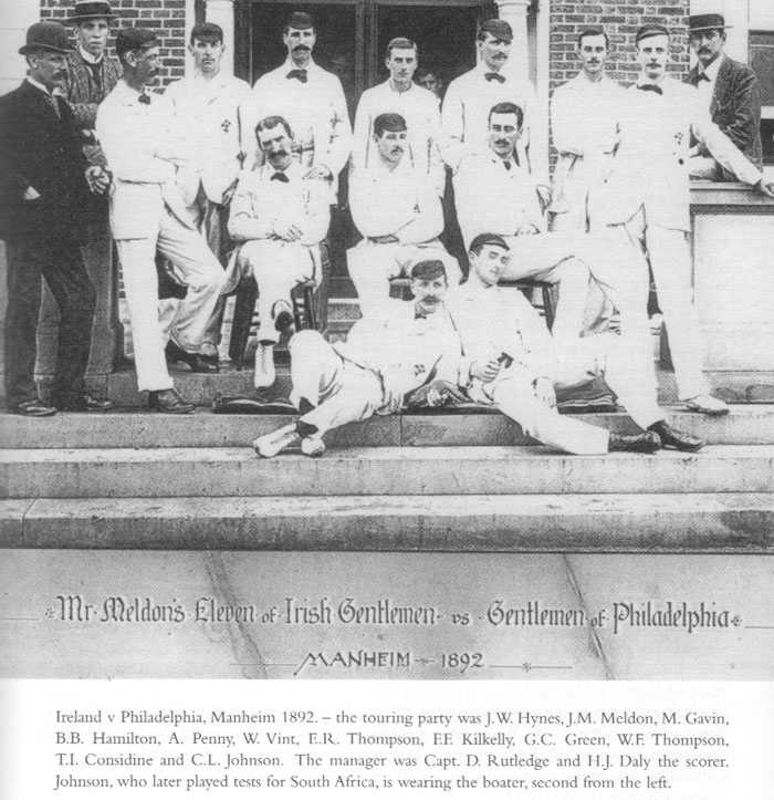 For Ireland Johnson was too ill to play and his fast bowling was badly missed on the rather bumpy newly laid wicket - Patterson King and Baily bowled with seven men behind the wicket at times. Hynes still had a badly damaged hand but in spite of this did splendid all round work. The Philadelphians were inclined to play his slows with their pads. Incidentally Hynes took 47 of his 63 wickets for Ireland in America and Canada. Kilkelly and Vint were also ill but had to play and W.F.Thompson replaced Johnson. About Vint's wicket keeping there were mixed reports. The Philadelphians said he was superb but his teammates maintained he was too ill to be at his best.