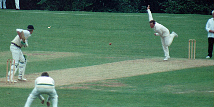 In the first he disposed of a stylish looking opening batsman called Ramprakash, caught by future Rugby international Vinny Cunningham for 9, while in the second he had the wicket of David Leatherdale, later for many years a mainstay of the Worcestershire middle order and now that county's chief executive. Eddie's best match was against Wales at Ynsygrewn in 1988, when rain prevented a potentially interesting finish. In the Welsh first innings Eddie had figures of 31-9-75-4, with only the Welsh captain Robert Croft, playing him with any confidence.