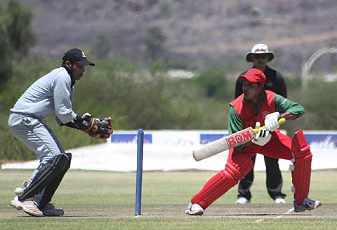 Oman v UAE: Sultan Ahmed of Oman glances the ball