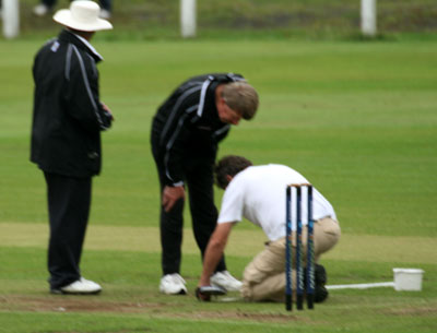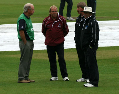 Umpire Louis Fourie calls no ball as Denmark have a bounce game in the rain