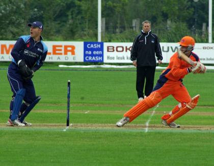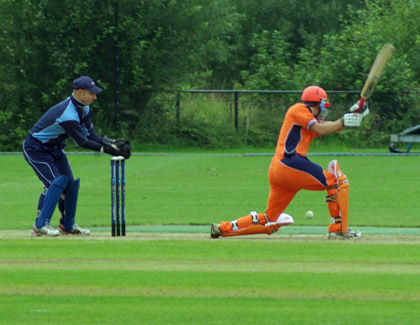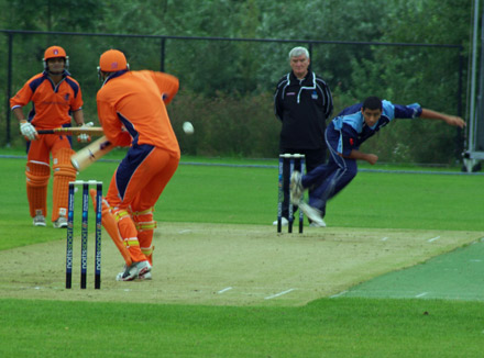 Qasim Sheikh plays and misses at a Ruud Nijman delivery