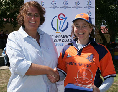 Netherlands v Papua New Guinea: Caroline de Fouw receives her Player of the Match award from Betty Timmer