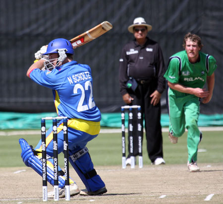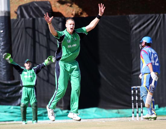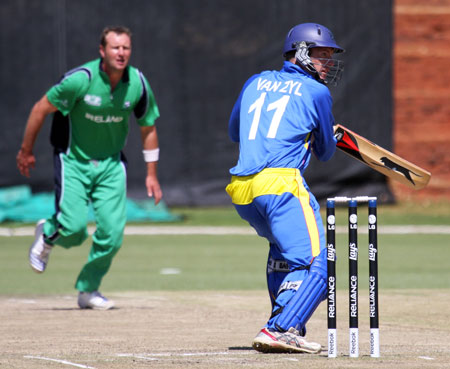 Boyd Rankin appeals for lbw against Raymond van Schoor