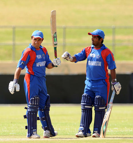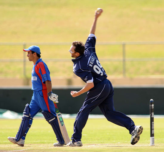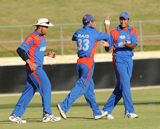 - Craig Wright is congratulated by Colin Smith for dismissing Afghanistan's Mohammad Shahzad Mohammad for 22 runs.