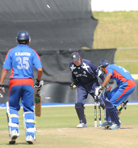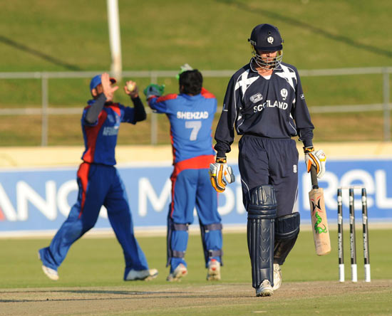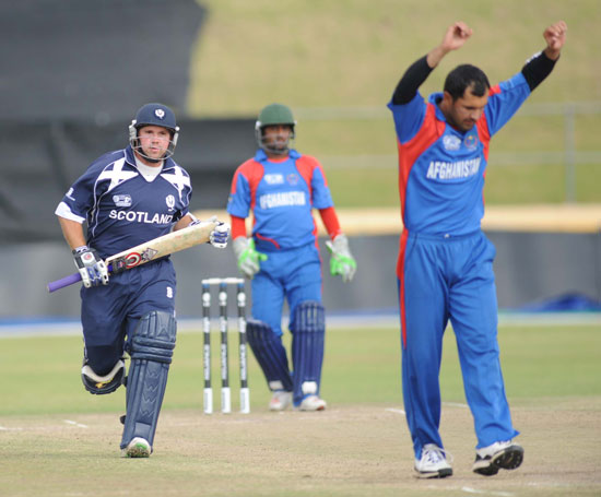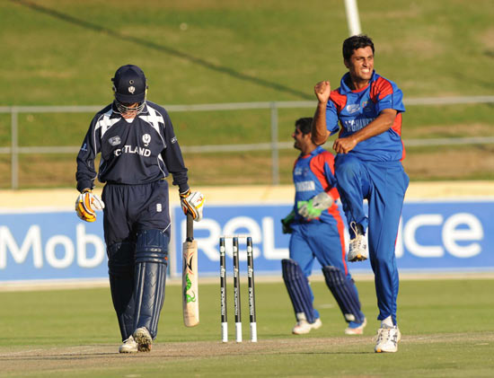 - Shapoor Zadran celebrates the dismissal of Scotland's Craig Wright for a golden duck.