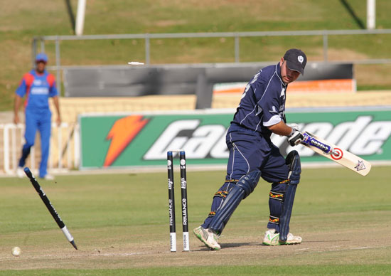 - Under pressure Scotland skipper, Ryan Watson, is clean bowled by Afghanistan's Khaliedaad Noori for a very disappointing 14 runs.