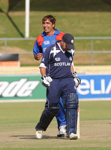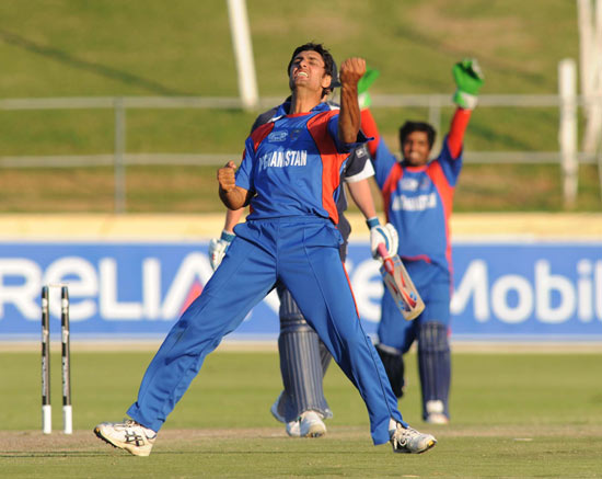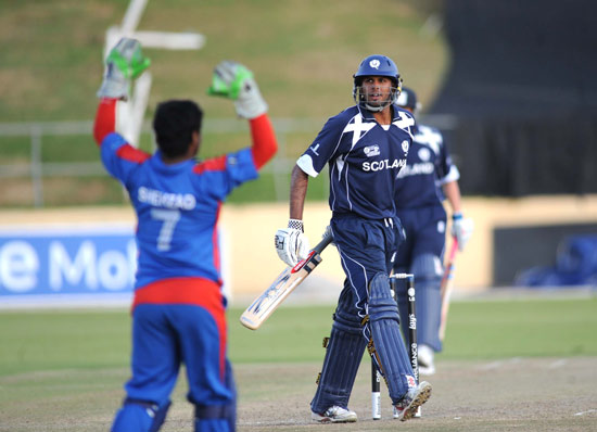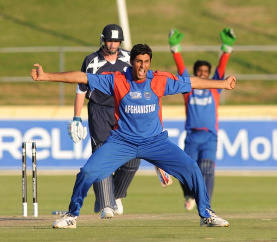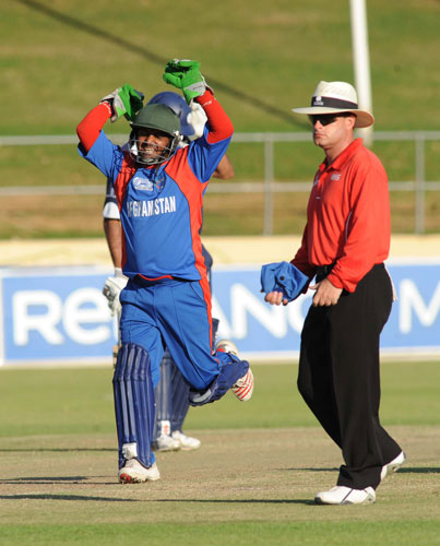 - Shapoor Zadran celebrates the dismissal of Scotland's John Blain to win the match.