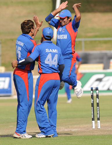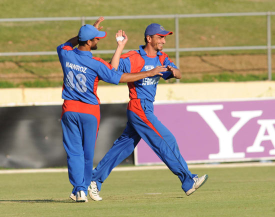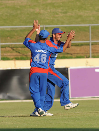 - Jan Stander is congratulaed by Navdeep Poonia for dismissing Afghanistan's Noor Ali Noor for 24 runs.