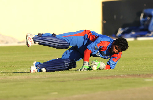 - Afghanistan wicket keeper, Mohammad Shezad Mohammad, fields the ball.