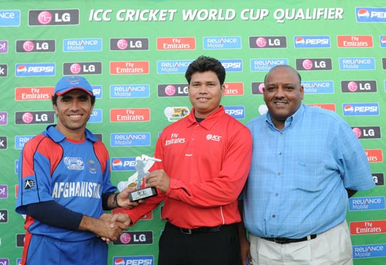 - Afghanistan's Karim Sadiq receives his Man of the Match award.