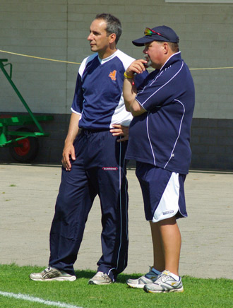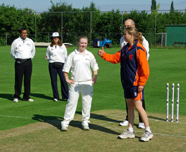 Scottish skipper Lynne Dickson calls correctly as Christine Erkelens tosses the coin
