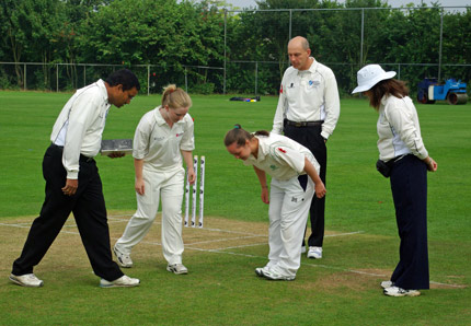 Louise McCarthy bowling to Priyanaz Chatterji