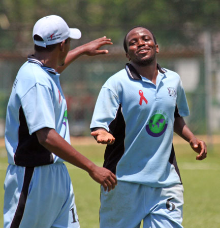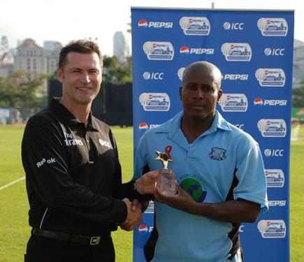 Botswana's James Moses receiving his Man of the Match award from umpire Simon Taufel