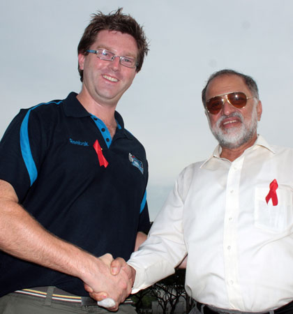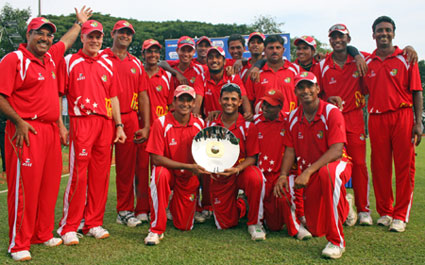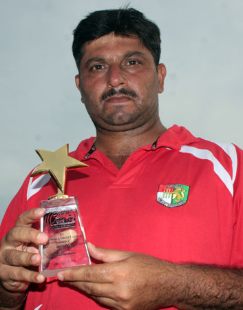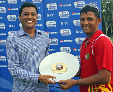The trophy is presented to Chetan Suryawanshi by Chief Executive of the Asian Cricket Council Syed Ashraful Haq