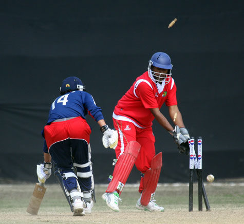 Pramodh Singaraja goes past the outside edge of Dipendra Chaudhary
