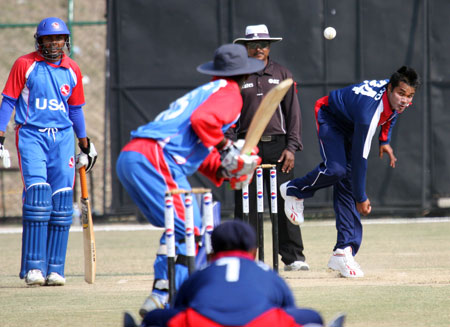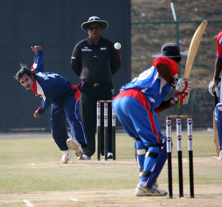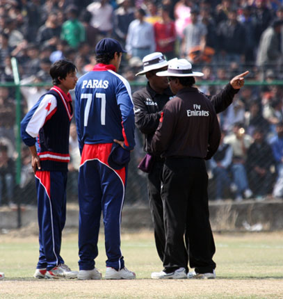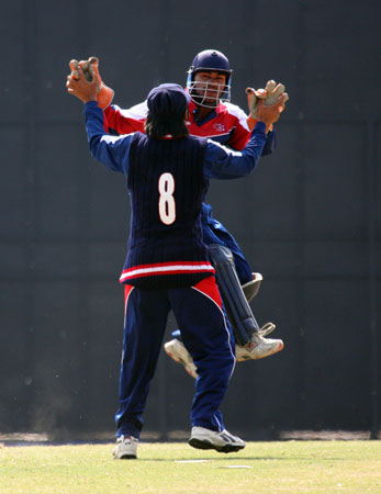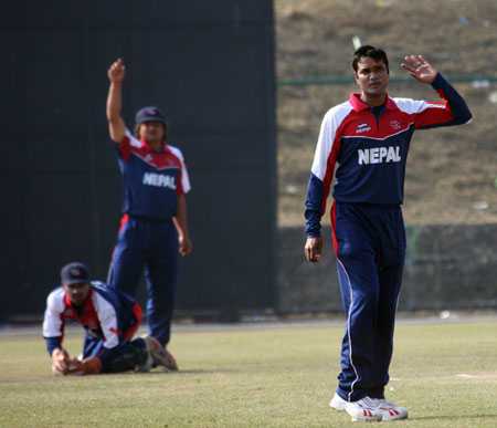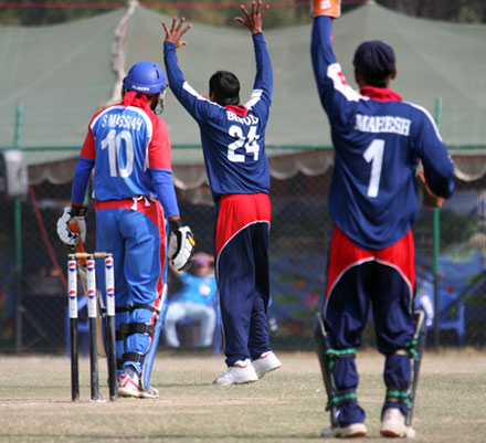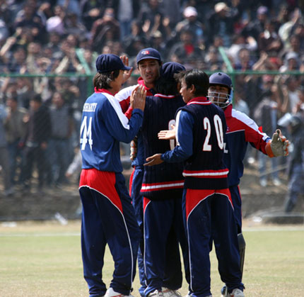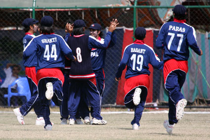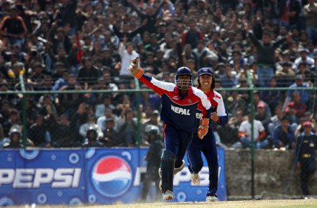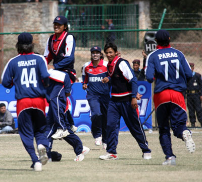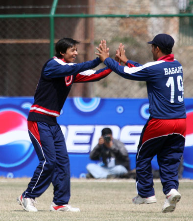 Mahesh Chetri and Shakti Gauchan celebrate the wicket
