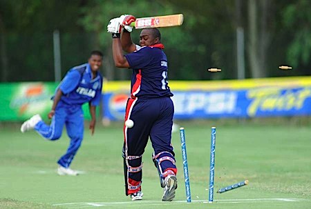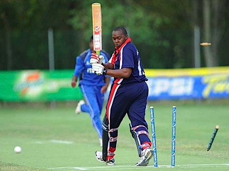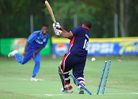 Kevin Bazil is clean bowled by Munasinghe