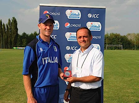 Player of the match, Italy's Andy Northcote, receives his award