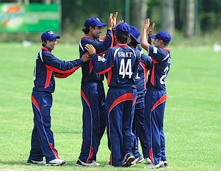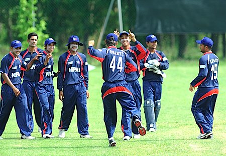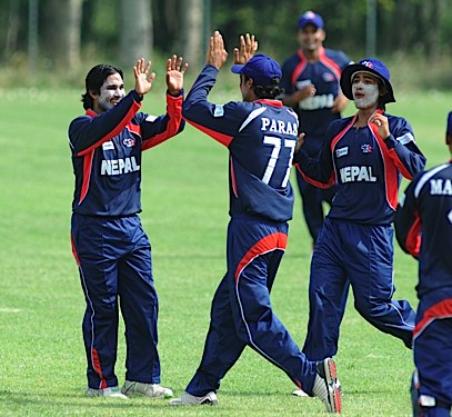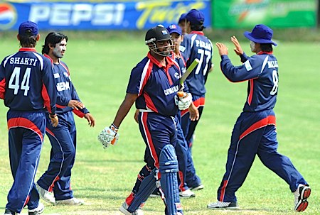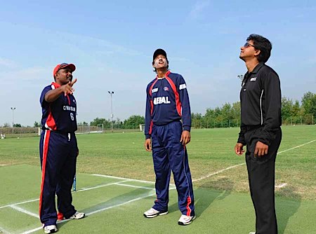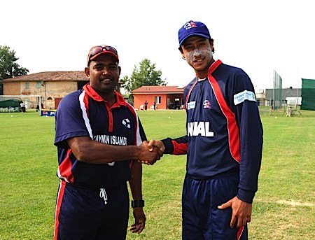 Captains Saheed Mohamed and Paras Khadka shake hands before the match