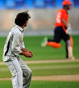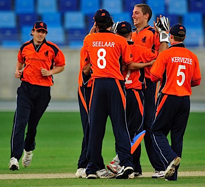 Congratulations among the Dutch as Arfan Haider is run out