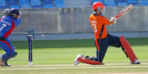 Atse Buurman is bowled by Hamid Hasan