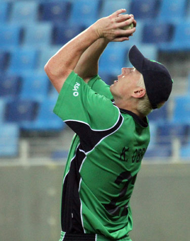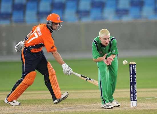17 year old George Dockrell celebrates after bowling Netherland's Peter Borren for 8 runs