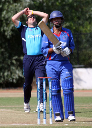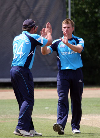 Cricket Scotland President Bob McParlane congratulates Gordon Drummond