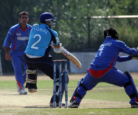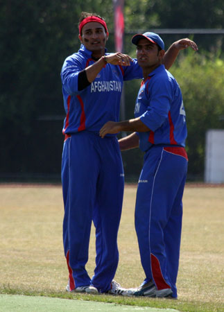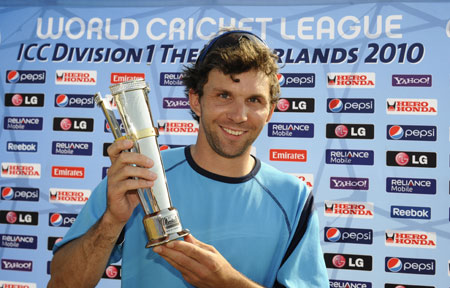 Hamid Hassan receives the CricketEurope Player of the Year award from John Elder and Rod Lyall of CricketEurope