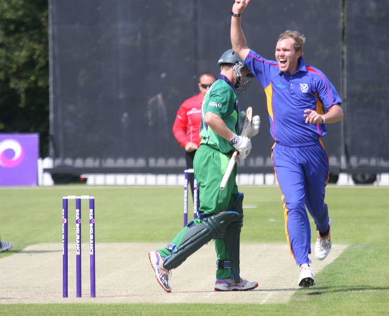 Trent Johnston edges to wicket keeper Ewald Steenkamp